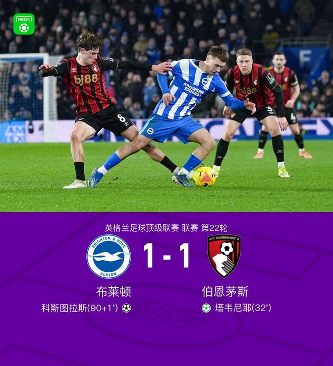 北京时间1月20日英超日报英格兰足球顶级联赛 联赛 第22轮,布莱顿主场对阵伯恩茅斯。上半场,阿德利造点,塔韦尼耶主罚命中。下半场最后时刻,范黑克助攻,科斯图拉斯倒钩绝平。全场比赛结束,布莱顿1-1伯恩茅斯。