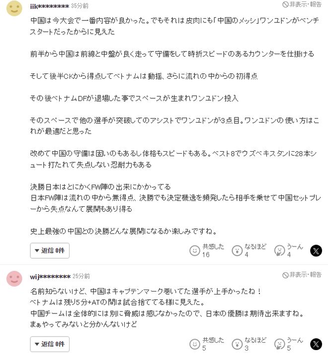 而对于U23国足在对阵越南时的发挥,日本球迷大都给予了很高的评价。有球迷表示:“中国队打出了本届赛事最佳的一场比赛。讽刺的是,这竟然是因为中国梅西王钰栋被放在了替补席上……中国队的防守稳固,而且他们兼具身材和速度优势。在四分之一决赛中,他们也展现出了耐心,尽管乌兹别克斯坦队射门28次,他们仍然没有丢球。与历史上最强球队中国队的决赛将会如何进行,令人期待。”