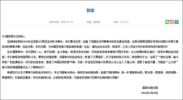 国家体育总局在贺信中表示,U23国足勇夺亚军,创造了我国在该项赛事中的历史最佳成绩,也是中国男足国字号球队时隔22年再次晋级洲际赛事决赛,经验可贵,作风可赞,为中国足球振兴燃起新的希望。