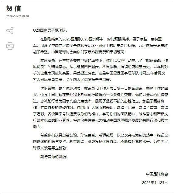 中国足协在贺信中表示,这份荣誉,是全体运动员、教练员和工作人员日复一日刻苦训练、辛勤工作的回报,也是中国足球在新征程上砥砺前行取得的一次关键性突破。U23国足以全队的拼搏奋进,忠诚践行着为国争光的光荣使命,展现了坚韧不拔的必胜信念,彰显了团结协作、并肩作战的过硬作风。球队用让人惊叹的表现,赢得了比赛,赢得了尊重,赢得了喝彩。各级国字号队伍要以U23国足为榜样,学习他们的团队精神、战斗意志和严格执行战术纪律的职业素养,将这份荣誉转化为推动中国足球振兴发展的共同行动和强大动力。