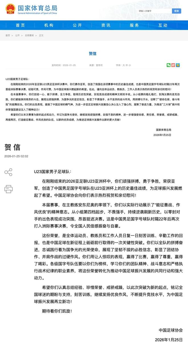 在刚刚结束的2026年亚足联U23男足亚洲杯决赛中,你们勇夺亚军,创造了我国在该项赛事中的历史最佳成绩,也是中国男足国字号球队时隔22年再次晋级洲际赛事决赛,经验可贵,作风可赞,为中国足球振兴燃起新的希望。在此,谨向全体运动员、教练员、工作人员表示热烈的祝贺和亲切的慰问!