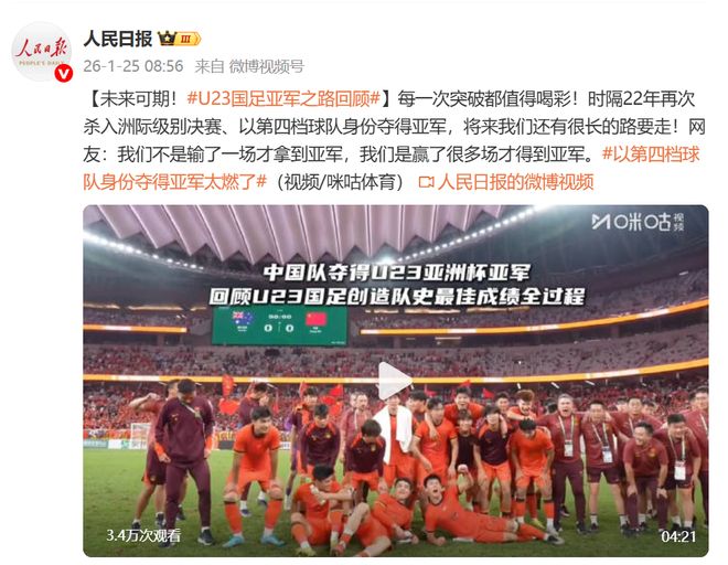 今天上午,@人民日报 官方账号发文:每一次突破都值得喝彩!时隔22年再次杀入洲际级别决赛、以第四档球队身份夺得亚军,将来我们还有很长的路要走!