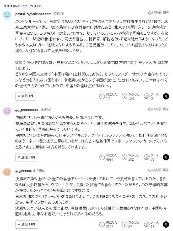 日本雅虎体育的球迷对董路的言论进行了讨论,其中点赞数超过2000的一条评论认为:“这种论调太过幼稚,明明一路打进决赛的所有比赛都用的5-3-2,现在又说这些。”国足本届杯赛打进决赛,凭借的正是532阵型,尤其是面对澳大利亚和乌兹别克斯坦等球队的时候,国足正是依靠低位防守才能力保球门不失,在半决赛之前的4场比赛国足能够在只打进1粒进球的情况下进入4强,防守无疑是最关键的原因。