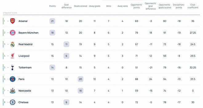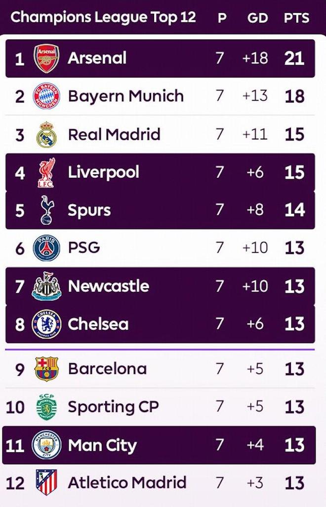 联赛阶段7轮过后,英超5支球队排名前八,展现出了强势的状态。能否创造6支球队晋级前八的奇迹,需要看曼城能否一鼓作气,在净胜球上超越巴萨和葡体,同时纽卡需要击败巴黎,切尔西、热刺、利物浦也都击败各自对手。