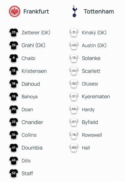北京时间1月29日德甲日报04:00,欧冠 联赛阶段第8轮,法兰克福主场迎战托特纳姆热刺,赛前双方球队首发名单公布如下: