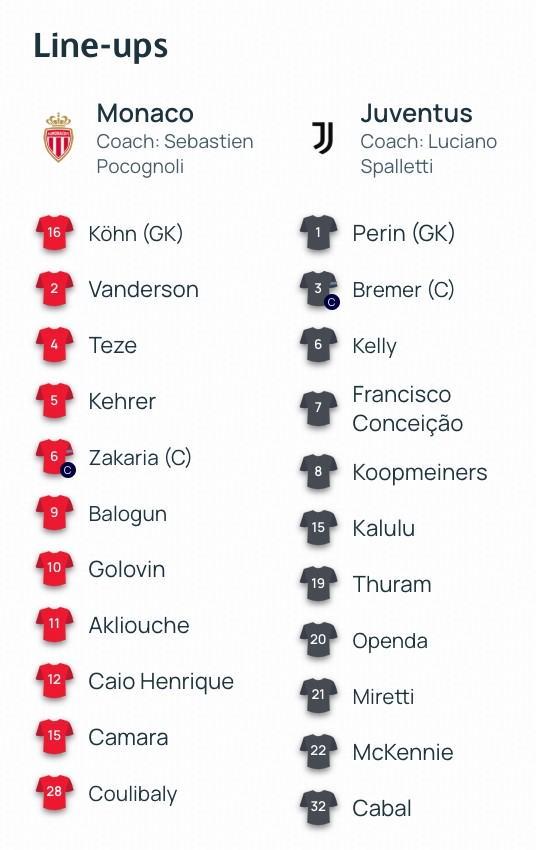 北京时间1月29日欧冠日报04:00,欧冠联赛阶段的一场对决。摩纳哥坐镇主场,迎战尤文图斯。赛前,双方的阵容公布如下: