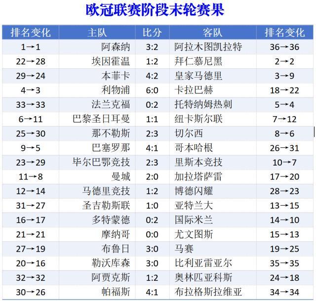 此外,在第6名对阵第7名的较量中,巴黎圣日耳曼主场1比1战平纽卡斯尔联,两队“同归于尽”双双跌出前8。最终,赛前的前8名中3支球队掉队,成全了巴萨、里斯本竞技和曼城升入前8,获得直通16强资格。英超参赛6队中,5队占据前八,最低的纽卡也高居第12。