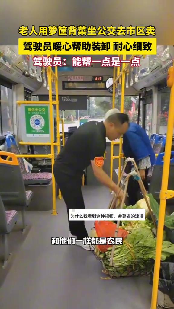 老人用箩筐背菜坐公交去市区卖,驾驶员暖心帮助装卸 耐心细致