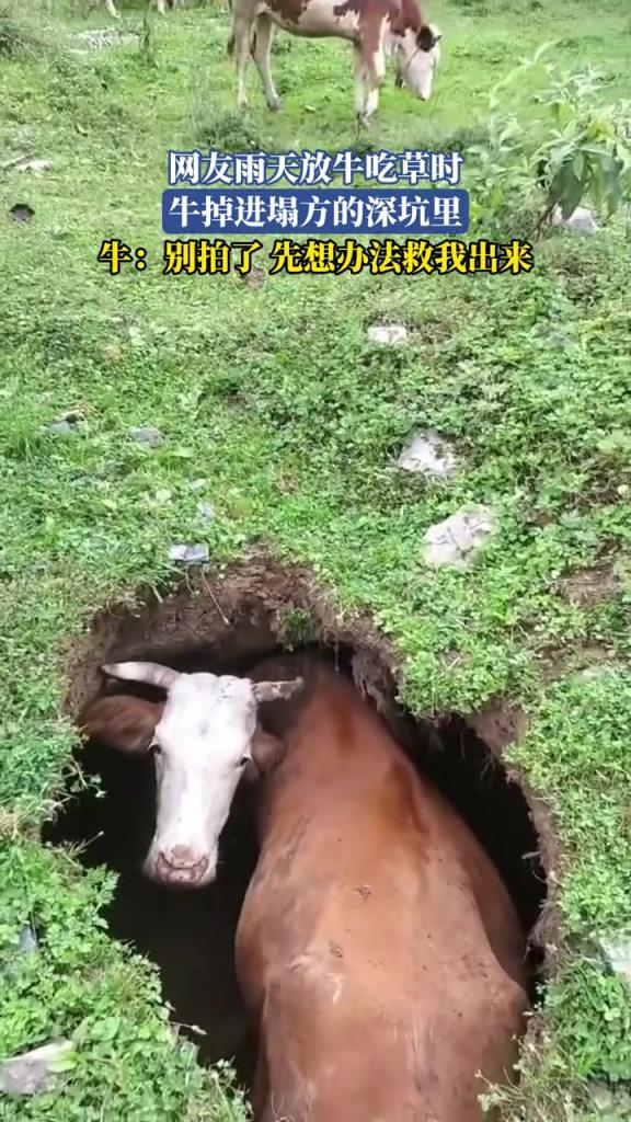 网友雨天放牛吃草时,牛掉进塌方的深坑里