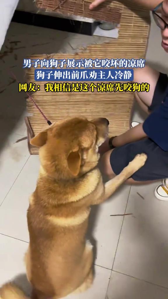 男子向狗子展示被它咬坏的凉席,狗子伸出前爪劝主人冷静