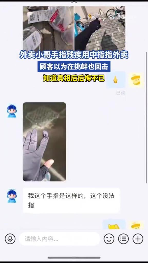 外卖小哥手指残疾用中指指外卖,顾客以为在挑衅也回击!