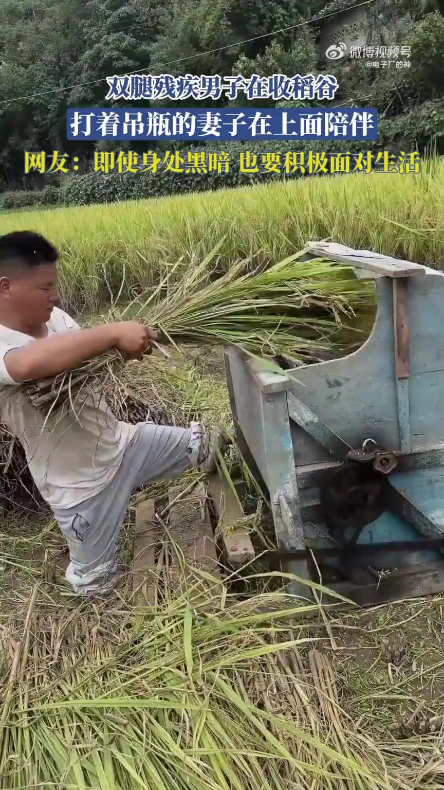 双腿残疾男子在收稻谷,打着吊瓶的妻子在上面陪伴!