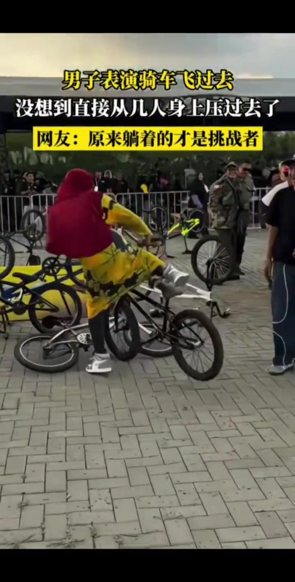 男子表演骑车飞过去,没想到直接从几人身上压过去