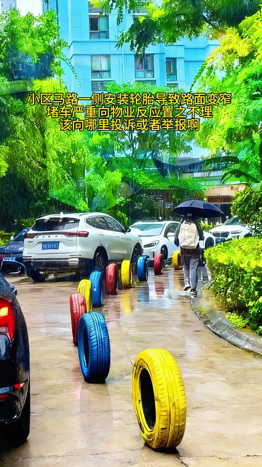 小区马路一侧安装轮胎导致路面变窄,堵车严重向物业反应置之不理
