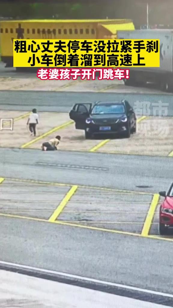 男子停车没拉紧手刹,小车倒着溜到高速上,老婆孩子紧急跳车!