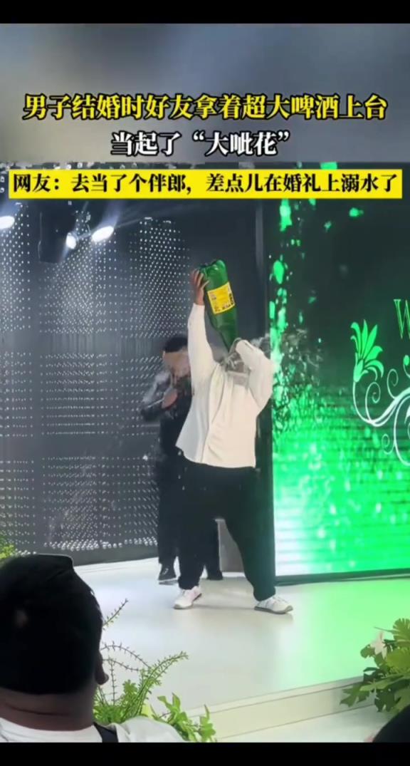 男子结婚时好友拿着超大瓶啤酒上台,当起了“大呲花”