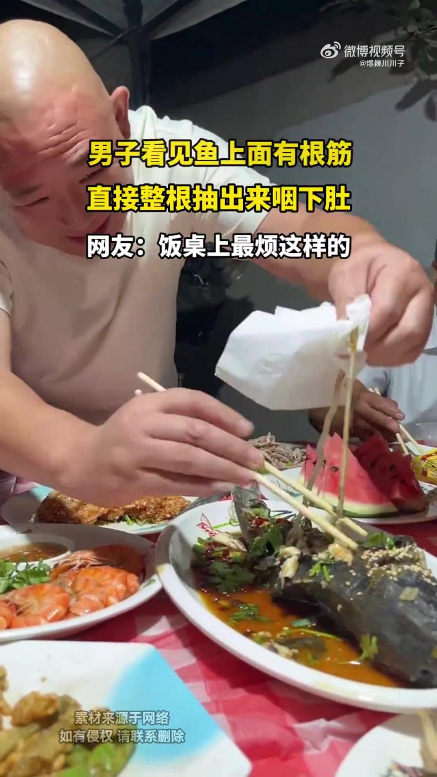 男子看见鱼上面有根筋,直接整根抽出来咽下肚!