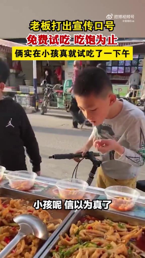 老板喊“免费试吃,吃饱为止”,俩实在小孩试吃一下午