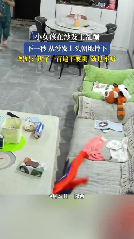 小女孩在沙发上乱蹦,下一秒 从沙发上头朝地摔下