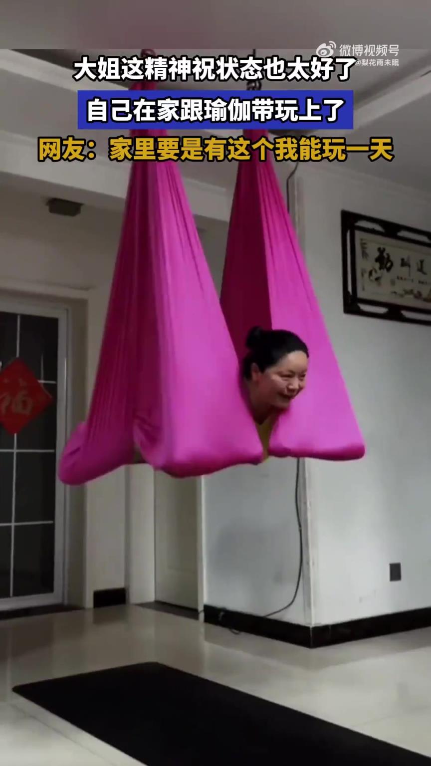 大姐这精神祝状态也太好了,自己在家跟瑜伽带玩上了