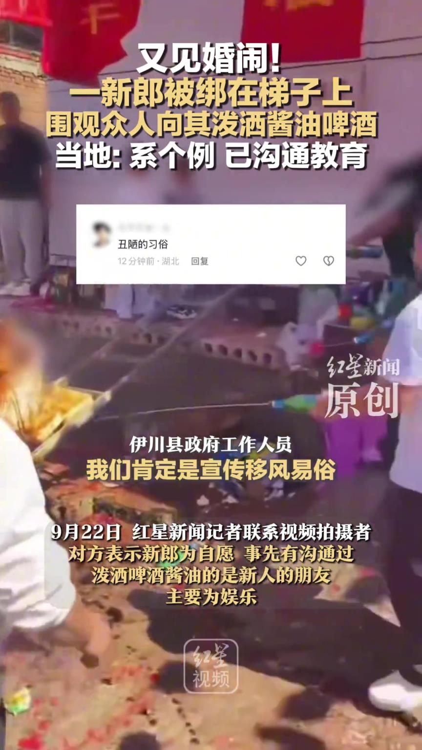 又见婚闹!一新郎被绑在梯子上 围观众人向其泼洒酱油啤酒