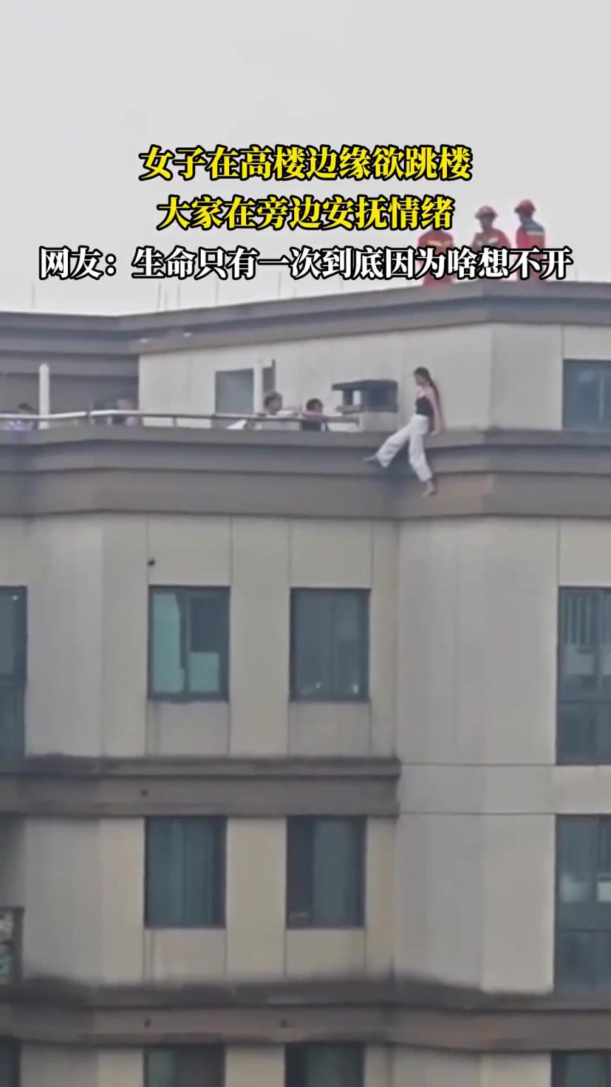 女子在高楼边缘欲跳楼,大家在旁边安抚情绪