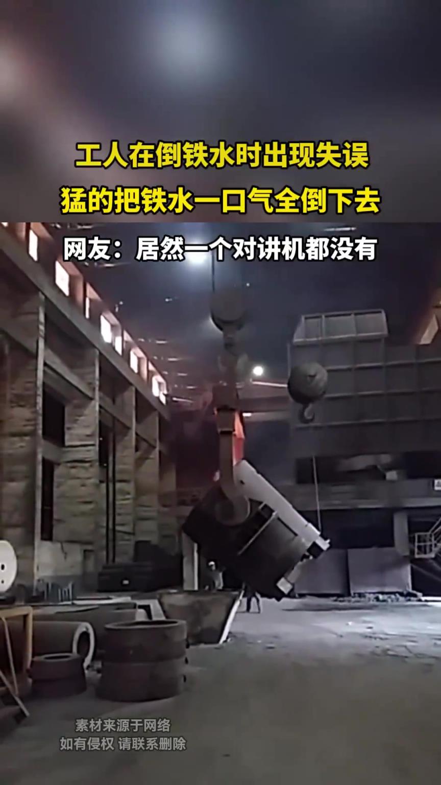 工人在倒铁水时出现失误,猛的把铁水一口气全倒下去