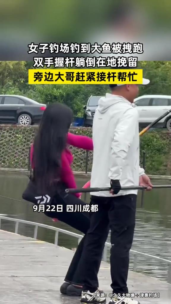女子钓场钓到大鱼被拽跑,双手握杆躺倒在地,旁边大哥赶紧帮忙!