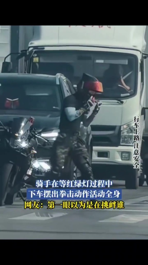 骑手在等红绿灯过程中,下车摆动拳击姿势,活动筋骨!