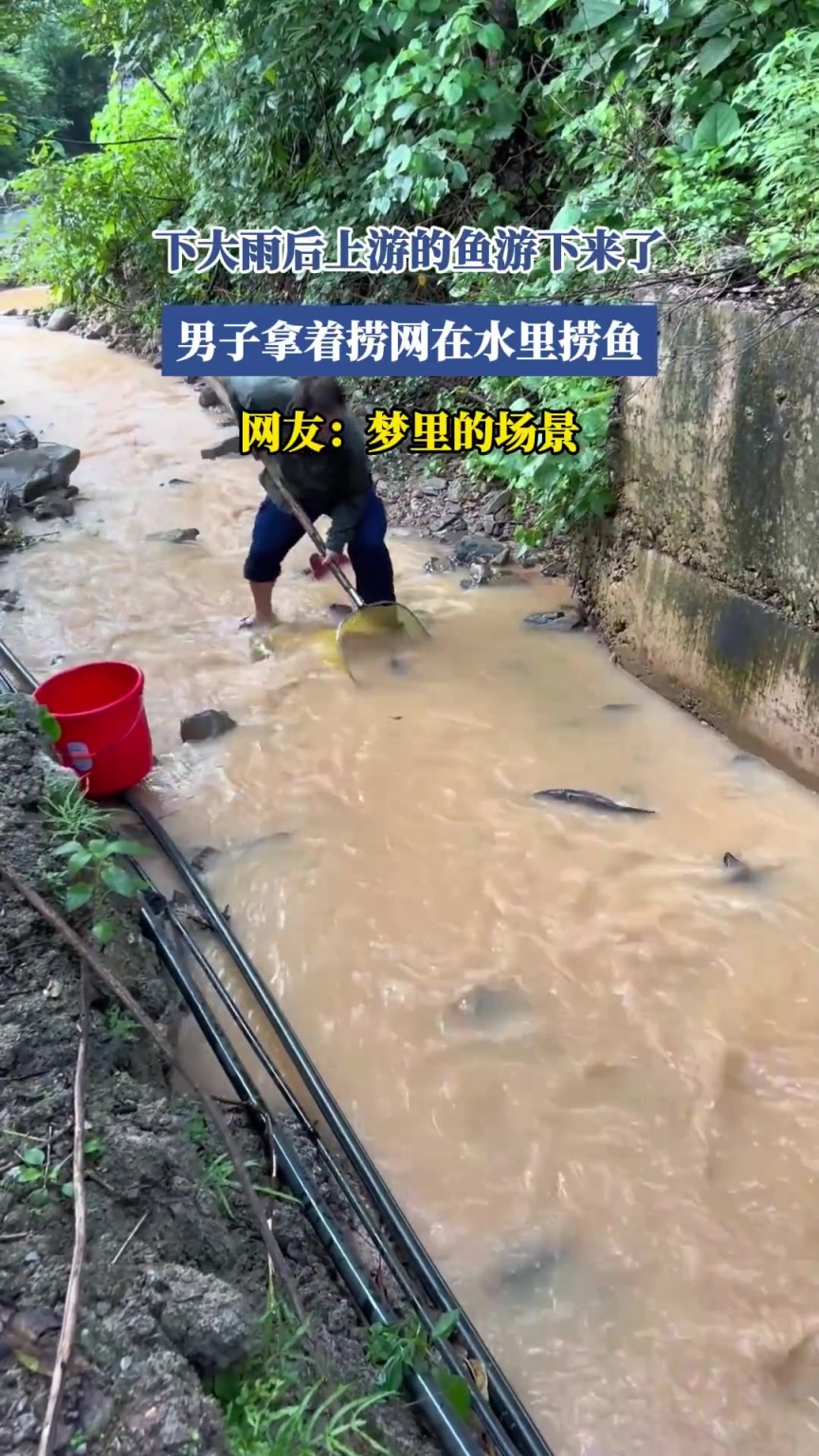 下大雨后上游的鱼游下来了,男子拿着捞网在水里捞鱼