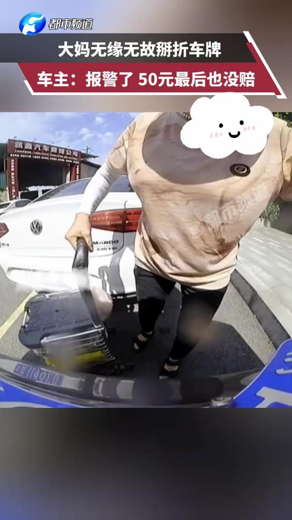 大妈无缘无故掰折车牌,车主:报警了 50元最后也没赔