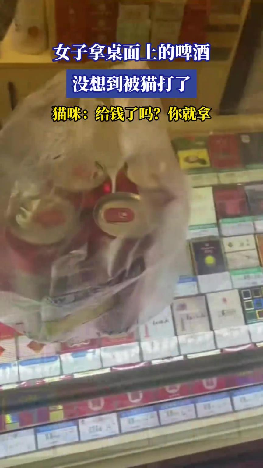 女子拿桌面上的啤酒,没想到被猫打了,猫咪:给钱了吗?你就拿