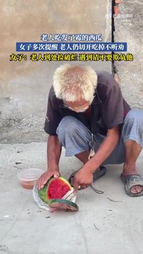 老人吃发了霉的西瓜,女子多次提醒老人仍切开吃掉不听劝