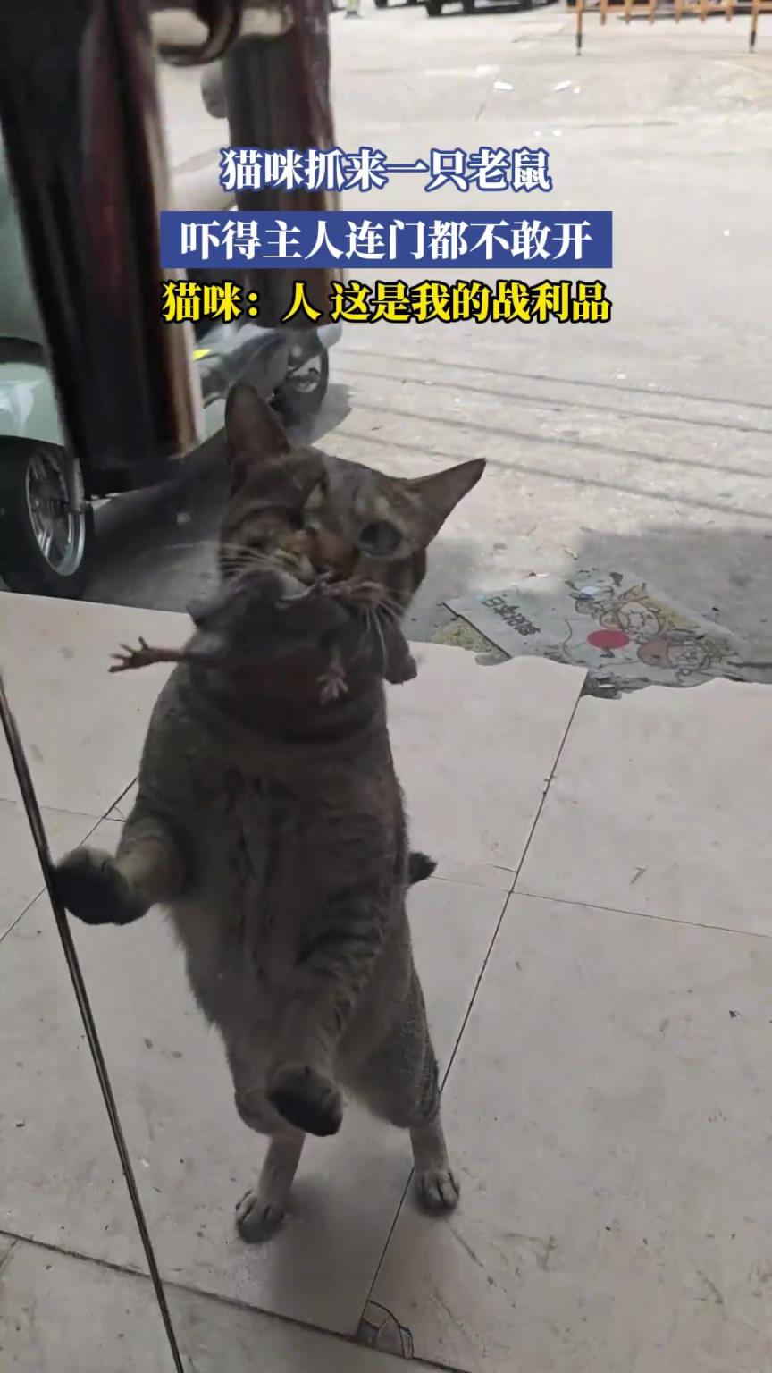 猫咪抓来一只老鼠,吓得主人连门都不敢开