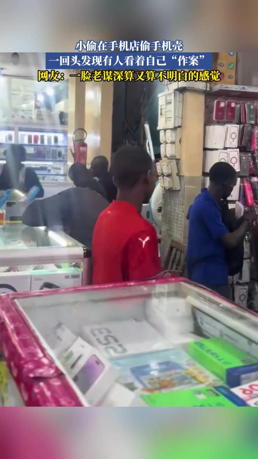 小偷在手机店偷手机壳,一回头发现有人看着自己“作案”