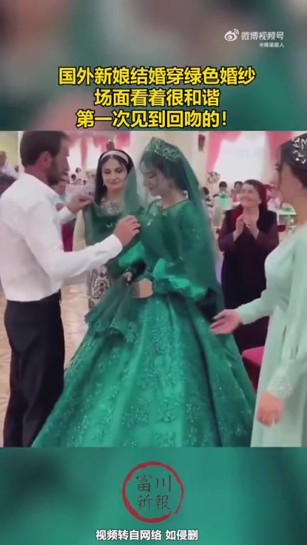 国外新娘结婚身着绿色婚纱