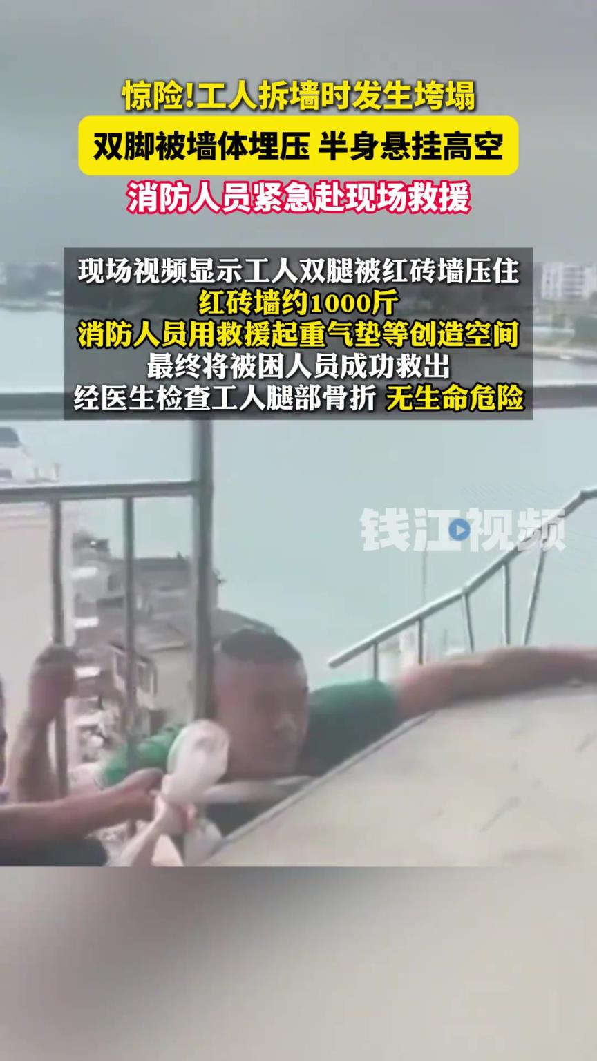 惊险!工人拆墙时发生垮塌,双脚被墙体埋压 半身悬挂高空