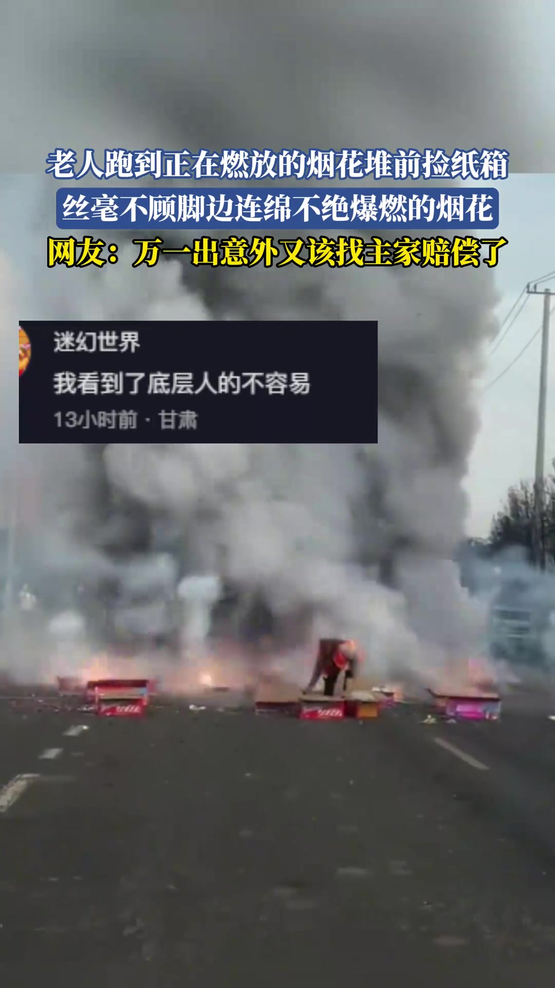 老人跑到正在燃放的烟花堆前捡纸箱,丝毫不顾连绵不绝爆燃的烟花