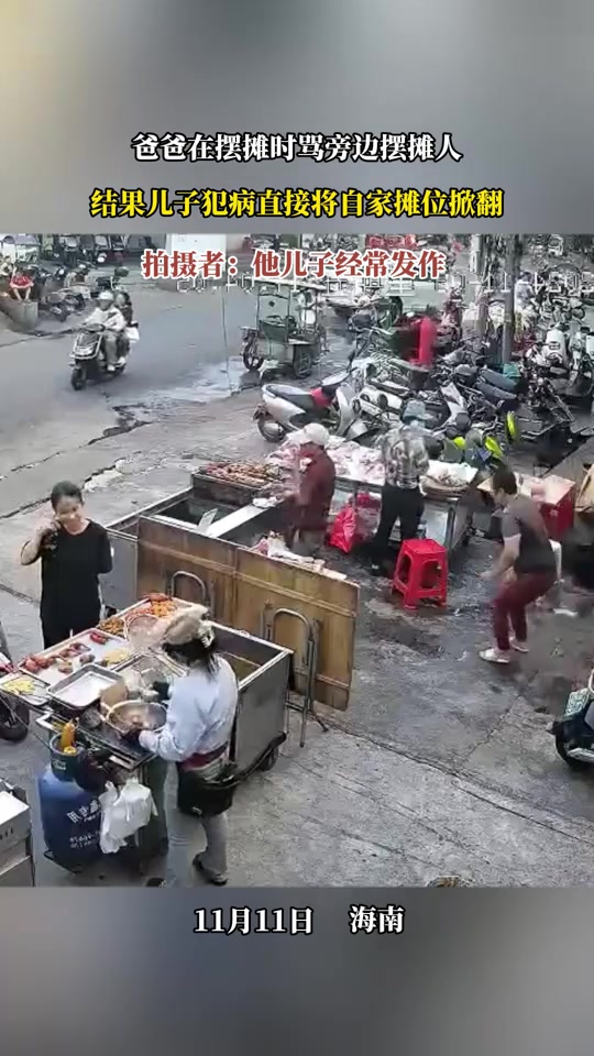 爸爸在摆摊时骂旁边摆摊人,结果儿子犯病直接将自家摊位掀翻