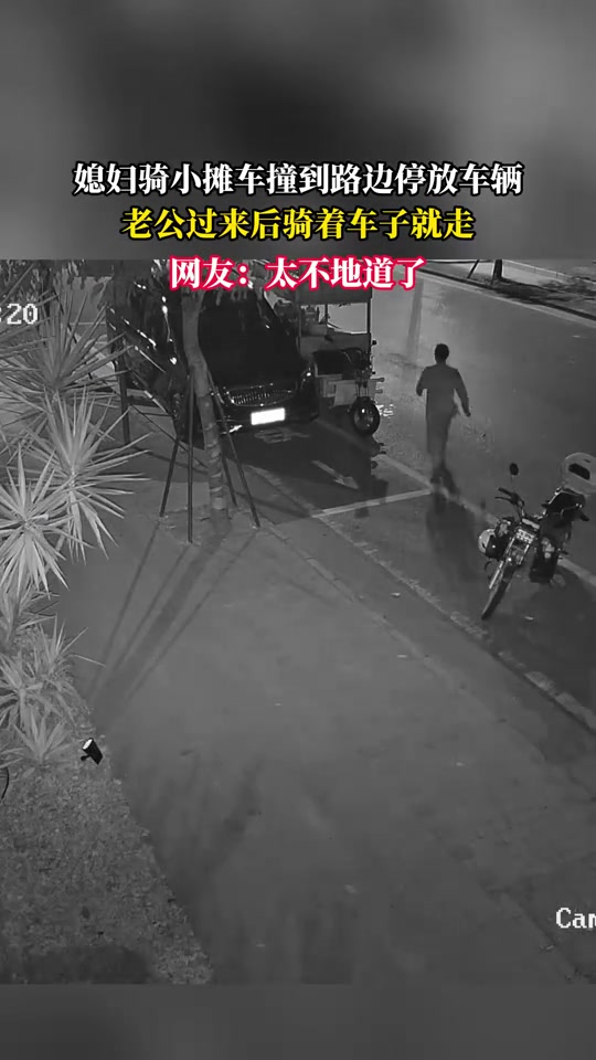 媳妇骑小摊车撞到路边停放车辆,老公过来后骑着车子就走