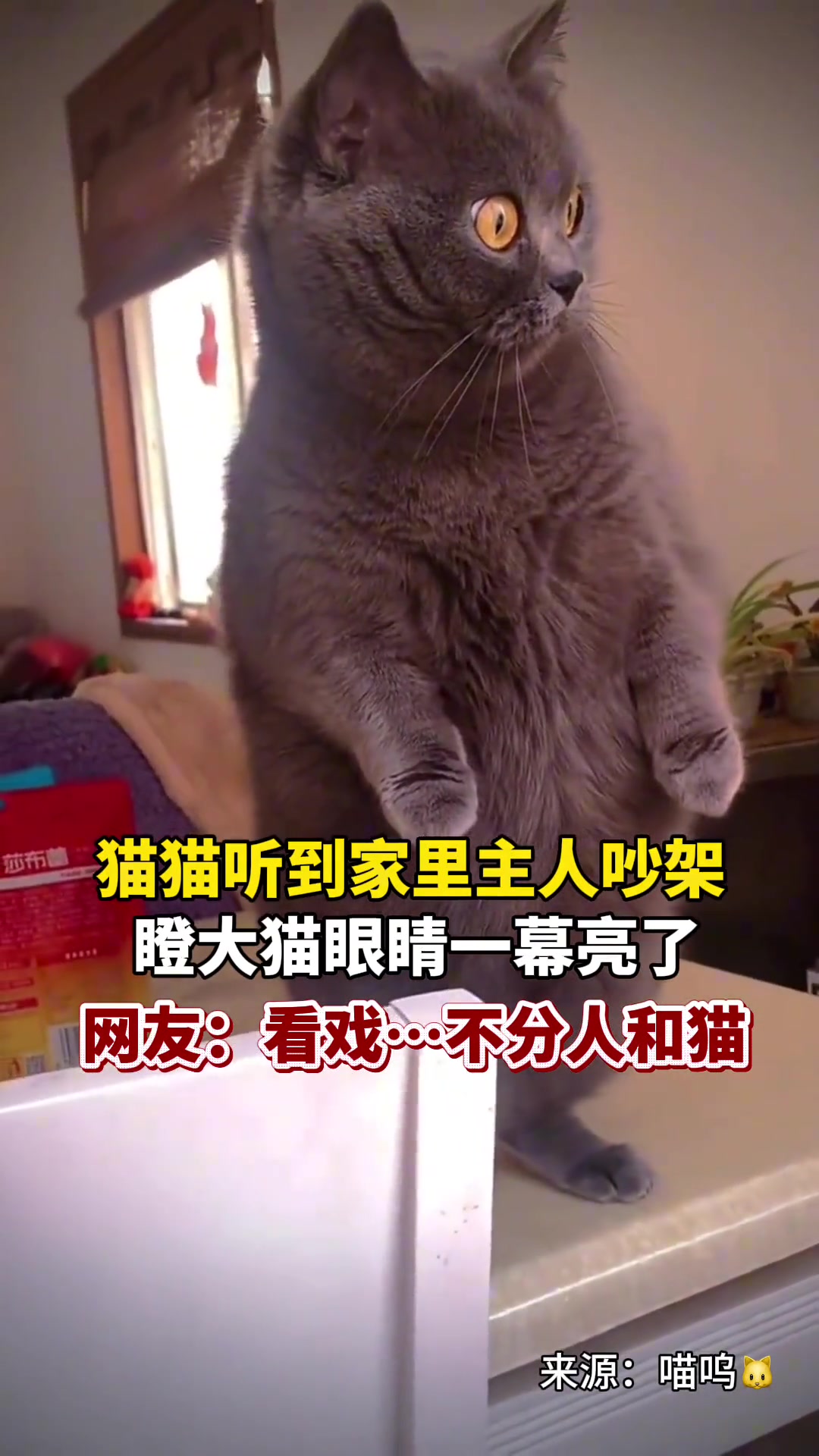 猫咪听到人吵架一幕表情亮了,网友:看戏不分人和猫
