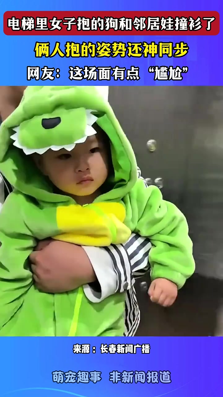 电梯里女子抱的狗和邻居娃撞衫了,俩人抱的姿势还神同步