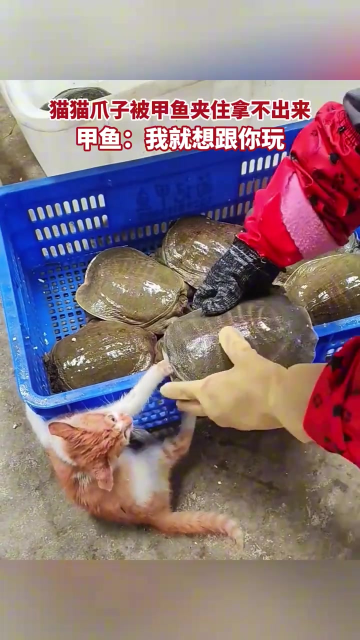 猫猫爪子被甲鱼夹住拿不出来,甲鱼:我就想跟你玩
