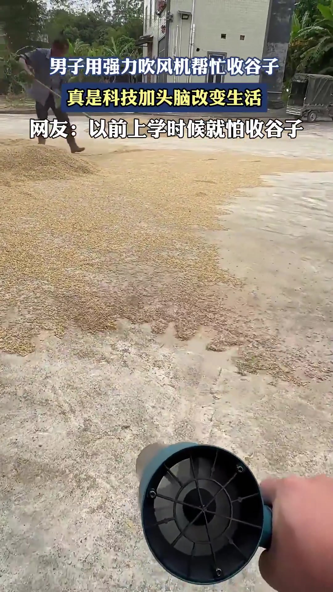 男子用强力吹风机帮忙收谷子,真是科技加头脑改变生活