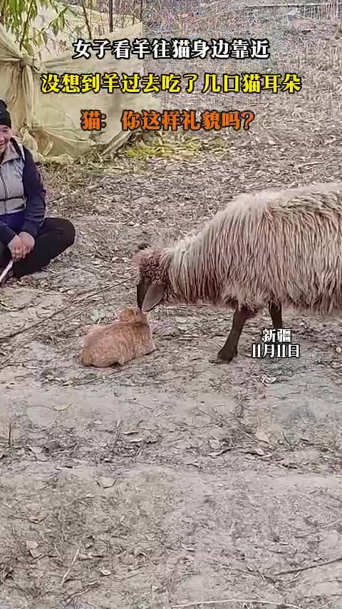 女子看羊往猫身边靠近,没想到羊过去吃了几口猫耳朵