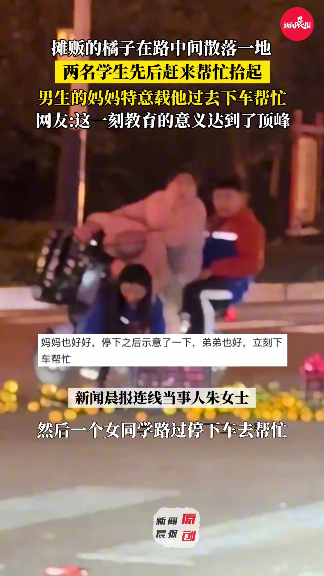 学生纷纷赶来帮摊贩拾起掉落的橘子