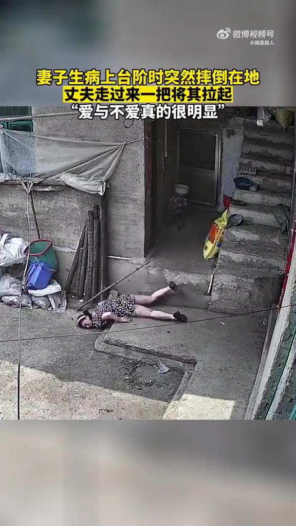 妻子生病上台阶摔倒,丈夫走来一把将其拉起