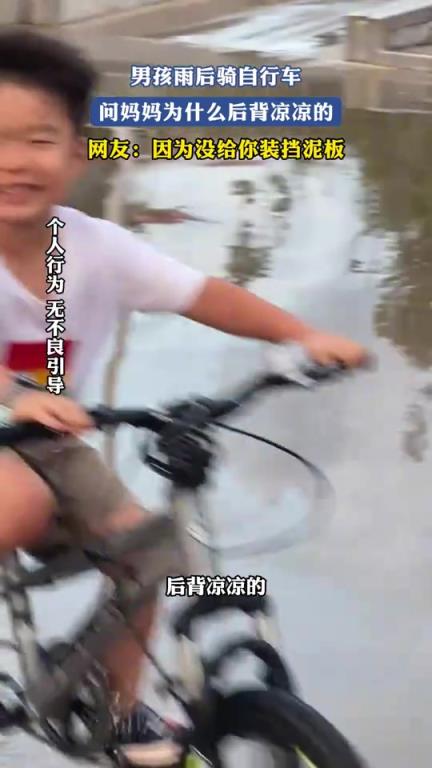 男孩雨后骑自行车,问妈妈为什么后背凉凉的,因为没给你装挡泥板