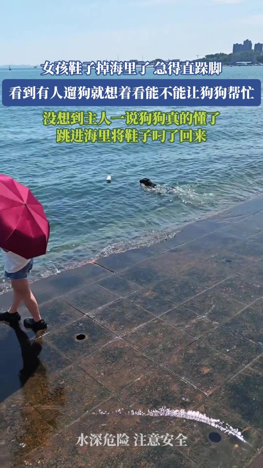女孩鞋子掉海里了,结果狗子帮忙捡回来了!