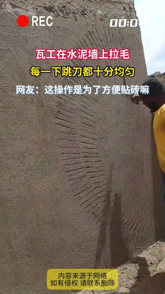 瓦工在水泥墙上拉毛,每一下跳刀都十分均匀!!